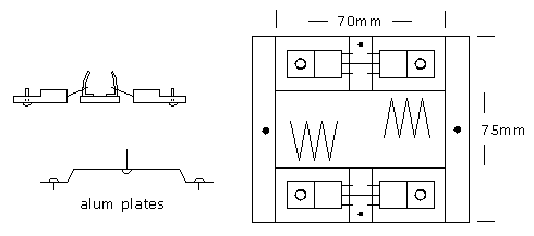 Notice that there are two places where wires cross near the input. That is done by drilling holes and jumping wires over the top. Board Pattern for Quad Input Amplifier Core type solder should be avoided at all times. Besides being messy and ineffective, it's slow promoting heat damage. Liquid rosin is very fast and efficient. It's applied with a toothpick, while the solder is picked up on the tip of the iron, which frees one hand. The electronic switching is controlled with soft touch momentary switches. Nowdays, various types of posts are available on those switches. Back in the old days (1986), I had to glue pieces of quarter inch rods (from poteontiometer shafts) onto flat swithces using epoxy. It is recomended that the entire current amplifier be constructed on an aluminum plate which is attached to the back panel for cooling. Then there is not a clutter of wires going back to the boosters; and the absence of long wires makes ringing easier to control. With the bridge amplifier, four boosters for each channel were attached to one aluminum plate. The aluminum plates are elevated about 8mm or more by making a double bend on the sides. The boosters are attached directly to the aluminum using mica insulators, while everything else is on a pc board.