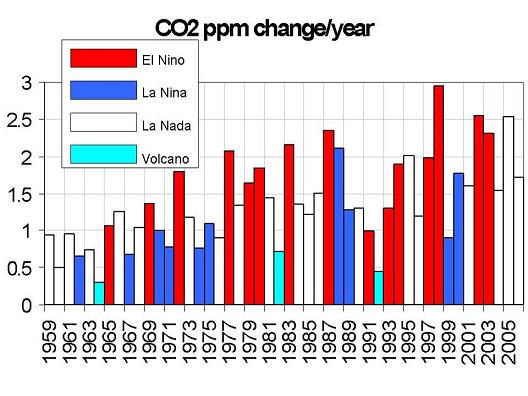 Graph of Carbon Dioxide and Ocean Temperature When an El Nino heats the Pacific Ocean, the amount of CO2 in the air increases, as shown by the red bars. When an El Nina cools the Pacific Ocean, the amount of CO2 in the air decreases, as shown by the blue bars.