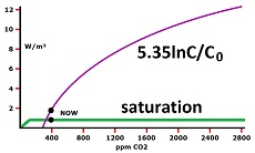 Radiation which strikes carbon dioxide doesn't go far (only 10 meters at sea level), which is called saturation. Doubling the carbon dioxide reduces the distance to 5 meters, which is a joke. But hell is supposed to be turned over because of it. |