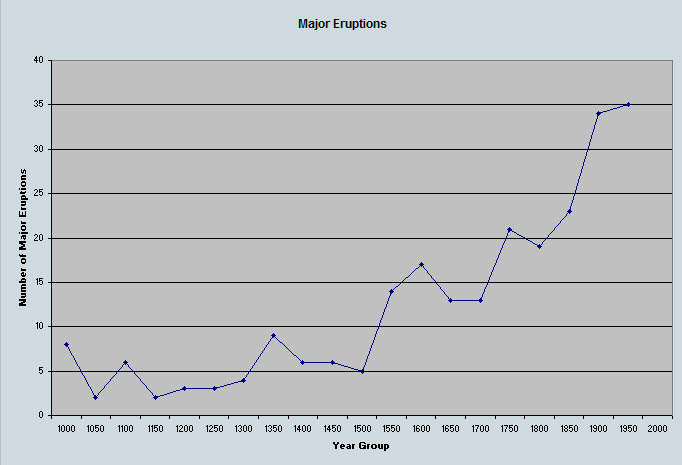 The following graph was prepared by Lee Kington showing that major volcanoes have been increasing in number over the past thousand years. This information is taken from data provided by the Smithsonian Institute at this location: